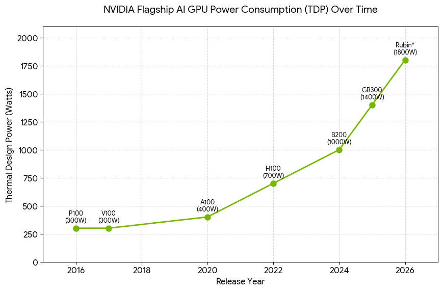In 2016, NVIDIA P100 consumed 300W per GPU. By 2022, the H100 had reached 700W. Today, the GB300 pushes 1400W, and next-generation Rubin architectures are expected to approach 1800W.
