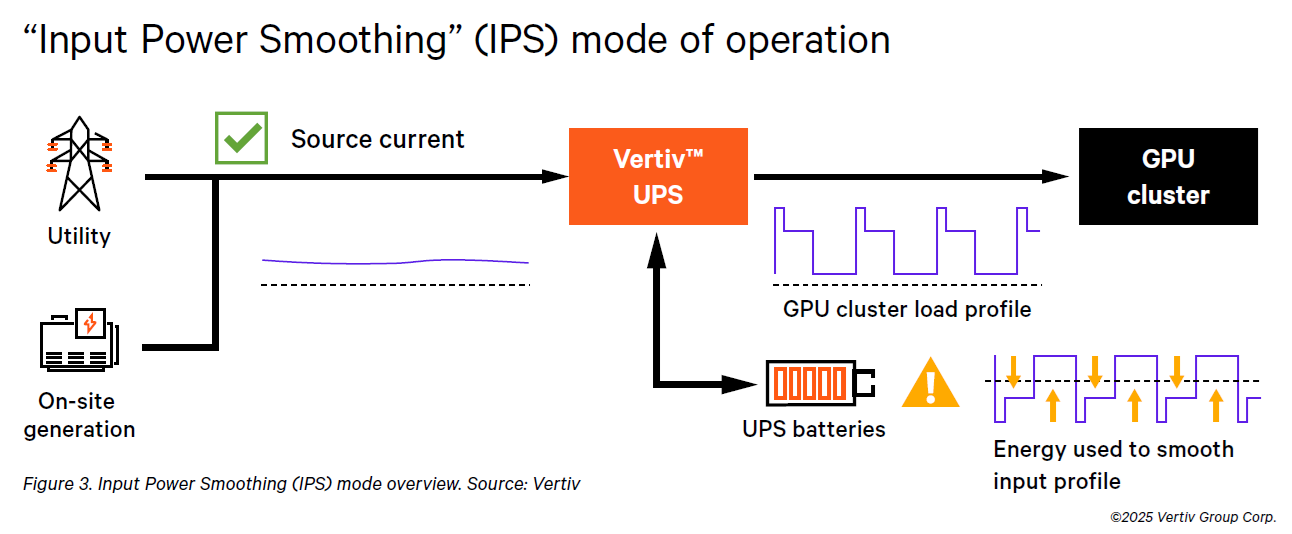 While Battery Shield protects the battery, Input Power Smoothing (IPS) protects everything upstream of the UPS: the switchgear, transformers, generators, and the utility grid itself. Instead of passing the violent power spikes of an AI load directly to the grid, the UPS uses the battery as an active power buffer.